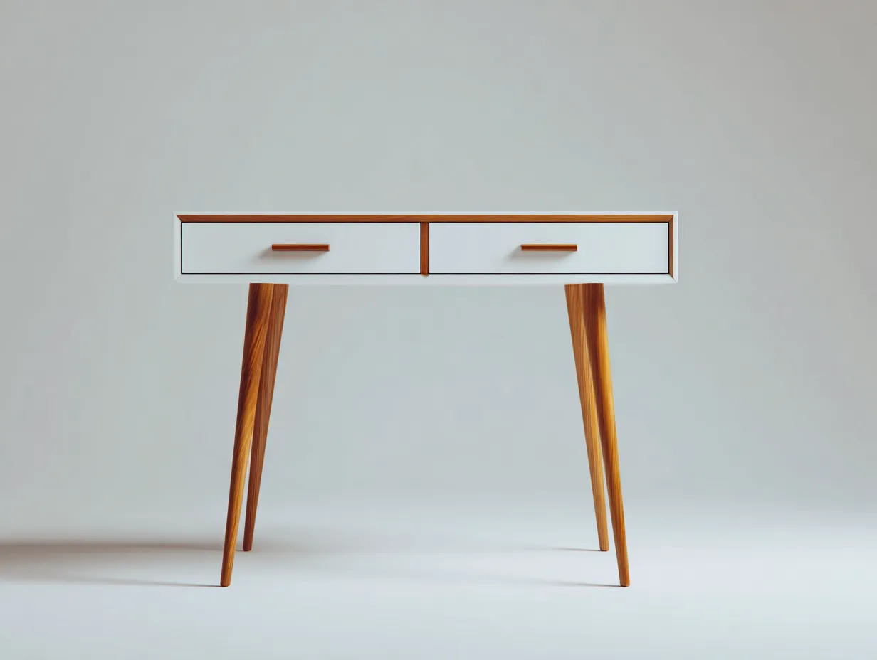 El escritorio combina una superficie en tono blanco con patas de madera en color natural que aportan calidez visual al conjunto. Los tiradores y detalles en madera resaltan el diseño contemporáneo, mientras que la estructura ofrece estabilidad durante el uso diario.