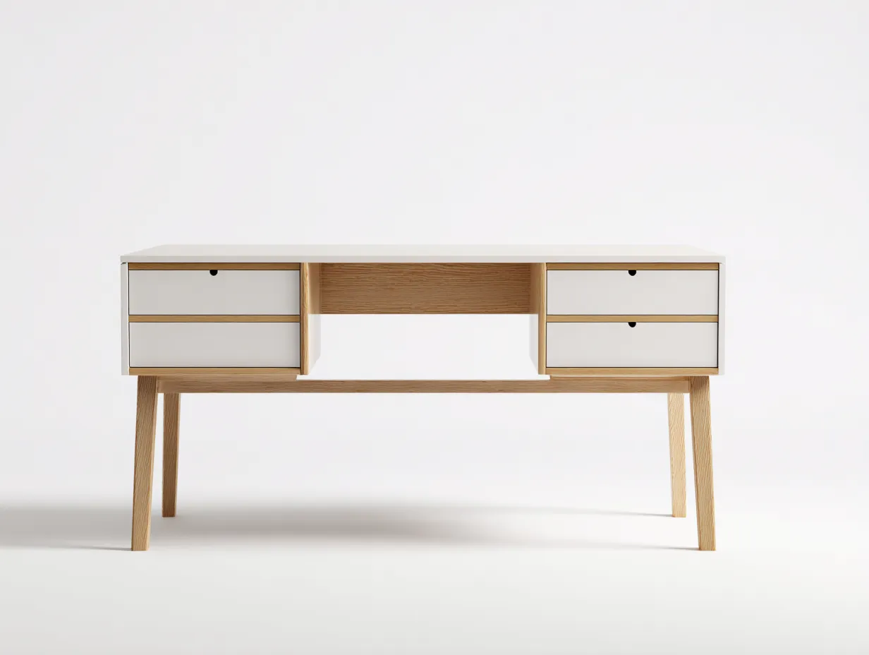 La mesa incorpora compartimentos y cajones que facilitan la organización de documentos, accesorios y material de trabajo. El espacio central abierto permite colocar un teclado, libros o dispositivos electrónicos de uso cotidiano.