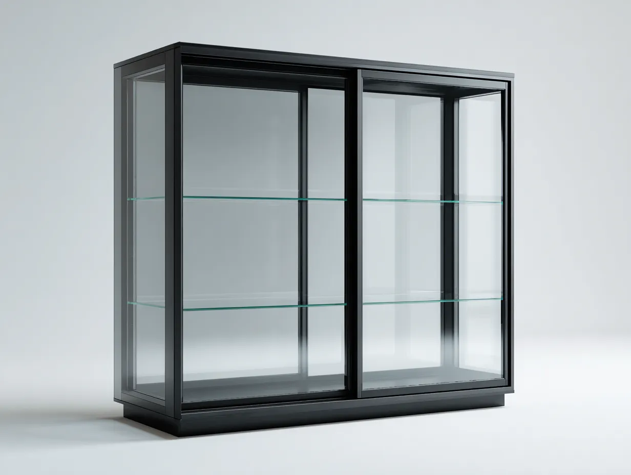 La estructura está fabricada en metal resistente con acabado en color negro. Los paneles laterales y frontales están elaborados en vidrio templado que ofrece transparencia y resistencia. En el interior incorpora estantes de vidrio que permiten organizar los objetos de forma ordenada.